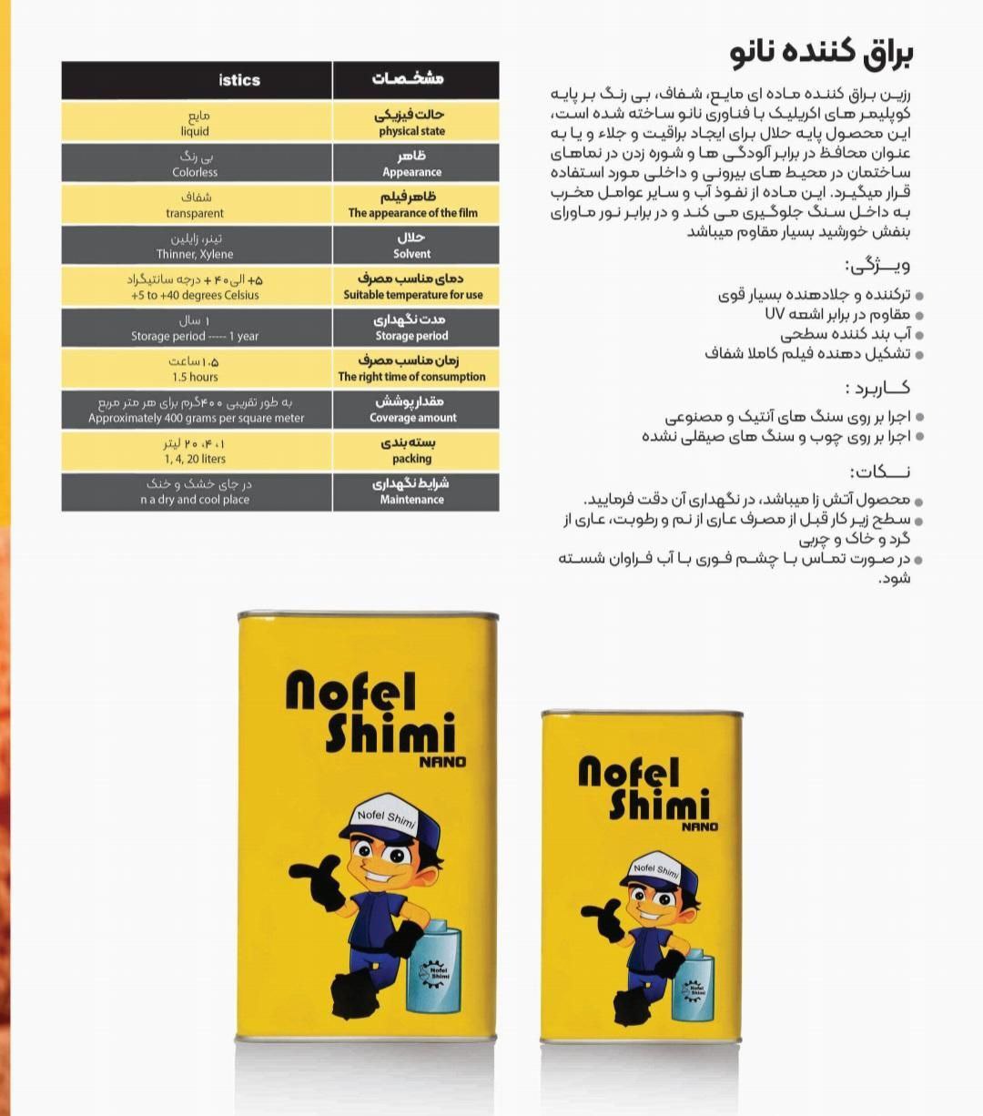 رزین براقکننده نوفل شیمی (نانو براقکننده سنگ) حجم 5 لیتری، پوششی شفاف و مقاوم است که با فناوری کوپلیمر اکریلیک تقویتشده تولید شده و مناسب برای افزایش درخشندگی و محافظت از سطوح سنگی، آجر مصنوعی، نماهای نسوز و مصنوعی میباشد